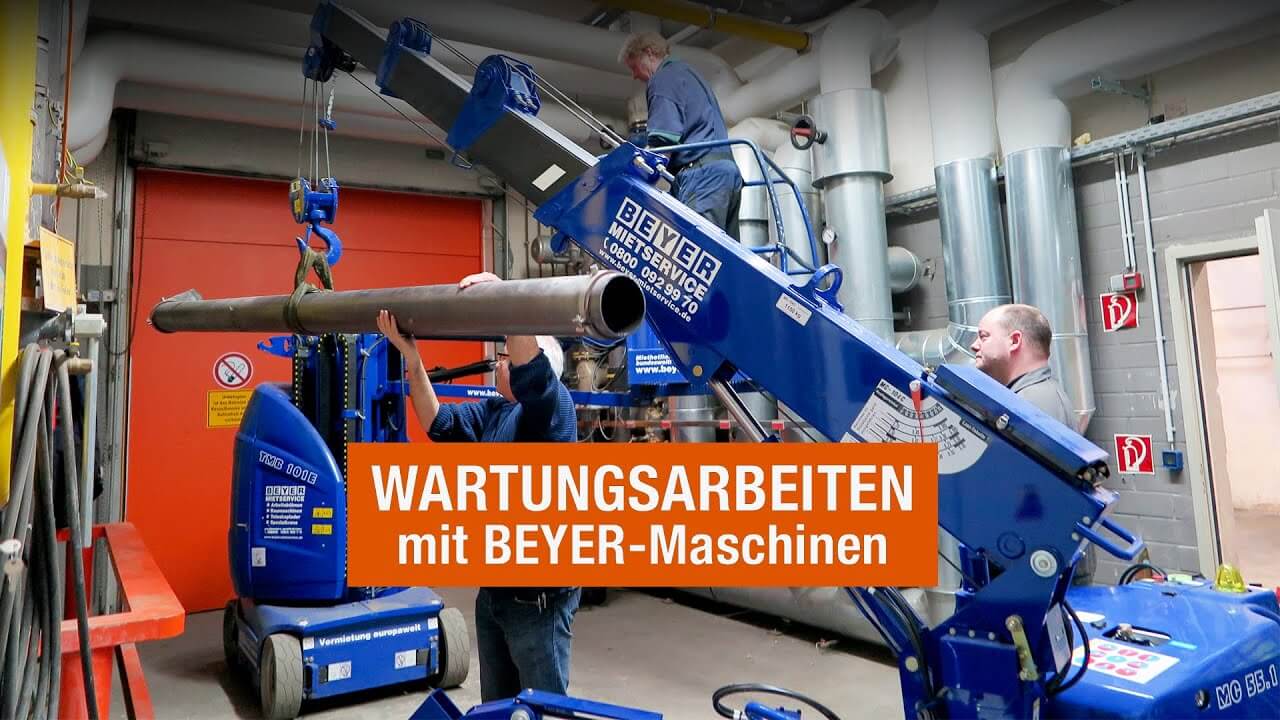 Wartungsarbeiten mit BEYER-MaschinenDer Spinnenkran verfügt über eine Transportbreite von 60 cm. Er passt durch eine Standardtür oder auch in einen Lastenaufzug. Mit einer Länge von 2,18 m und einer Höhe von 1,30 m lässt sich der Mietkran ganz leicht via Anhänger oder Leicht-LKW transportieren.