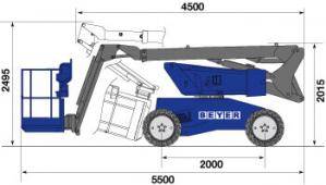 Eine maximale Arbeitshöhe von 11,91 m und eine maximale seitliche Reichweite von 6,69 m in Kombination mit einer maximalen Tragkraft von 230 kg im Arbeitskorb bietet die kompakte Diesel-Gelenkbühne GTB 120 D. Mit einer Länge von 5,50 m (ausgefahren) und einer Höhe von 2,50 m (Transportstellung) sowie einer Breite von 1,80 m gehört dieses Modell zu den kompakten Hubarbeitsbühnen für Einsätze im Außenbereich. Ein großer Arbeitsradius wird mit einem Schwenkbereich von 350° des Oberwagens realisiert.