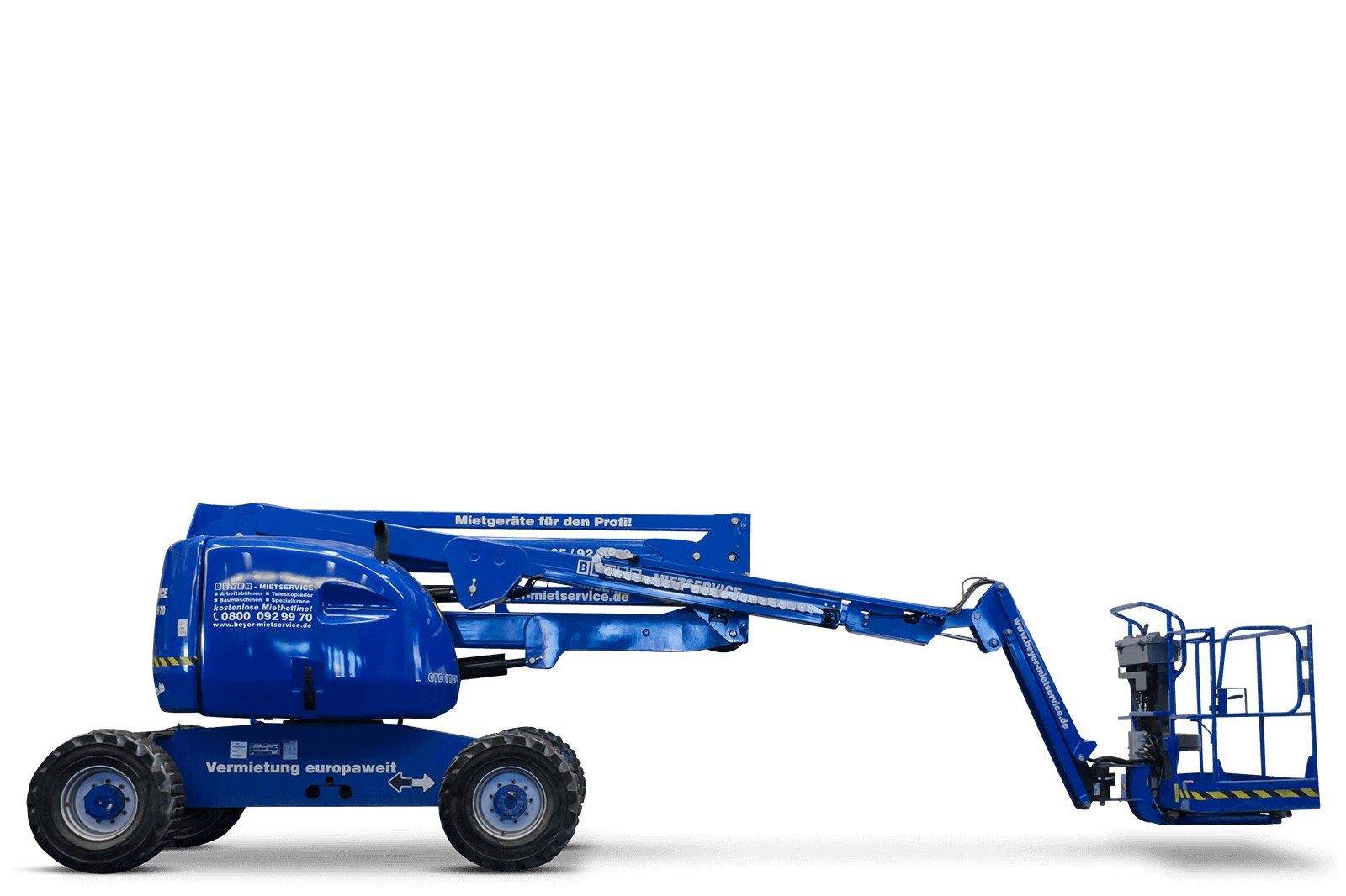 Der Schwenkbereich des Oberwagens beläuft sich auf genau 360°. Übrigens: beim Schwenken bleibt der Drehwagen innerhalb der Bühnenkontur. Dies ist besonders bei engen Platzverhältnissen praktisch. Sie haben jetzt noch weitere Fragen zu den Gelenkhubsteigern? Dann sprechen Sie uns einfach an.