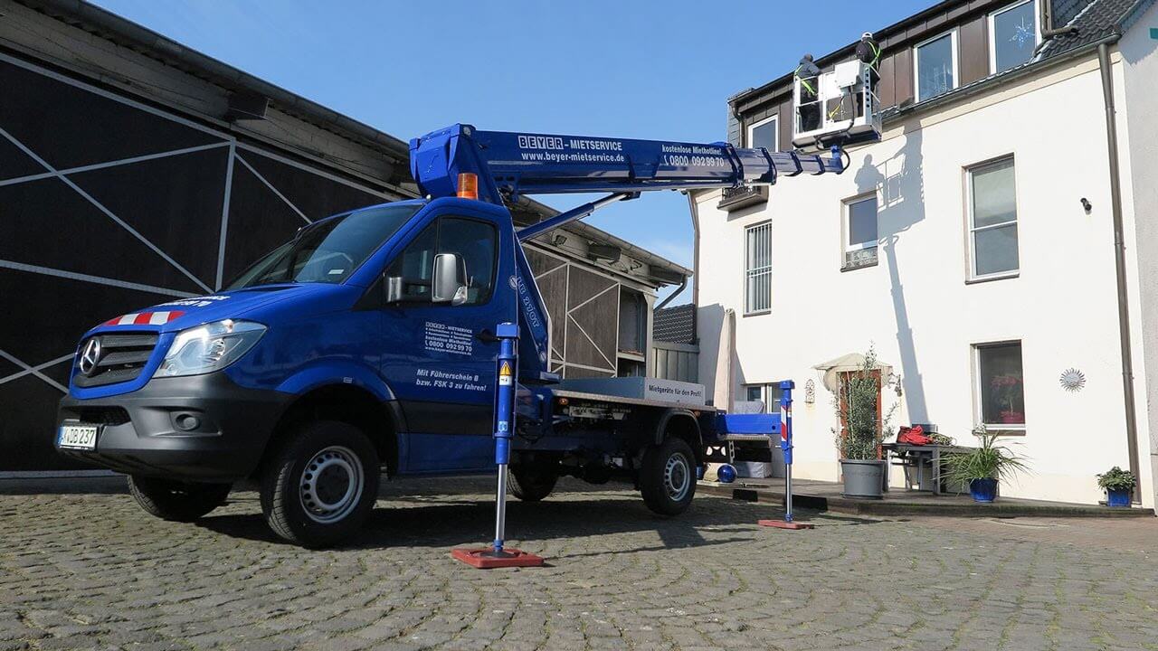 Beim Einsatz in innerstädtischen Bereichen sind besonders zwei Aspekte entscheidend: Kompaktheit und Umweltfreundlichkeit. LKW-Hebebühnen für Arbeiten in dicht besiedelten Innenstädten, Altstadtgassen, Parkanlagen, Fußgängerzonen, auf belebten Plätzen usw. sind in der Regel auf 3,5 t Fahrgestell aufgebaut. Größere, längere Fahrzeuge sind zwischen parkenden Autos, auf schmalen Fahrspuren und in engen Lichthöfen kaum rangierbar. Variable Abstützung mit Aufstellnivellierung und eine Abstützmöglichkeit innerhalb der Fahrzeugkontur ist unbedingt erforderlich, um sich gegebenen Platzverhältnissen optimal anzupassen.