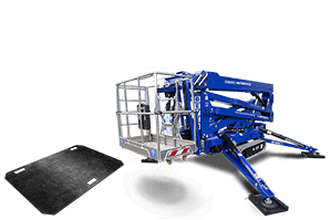 Bei maximaler Abstützbreite verteilt sich das Gewicht der Raupenbühne auf eine Fläche von 3,45 m x 3,60 m. Für eine flexible und standsichere Positionierung in abfallenden Bereichen, auf Treppenabsätzen oder neben Geländekanten sorgen vier flexible Hydraulikstützen. Böschungswinkel werden auf Korbseite bis zu 13°, auf Motorseite bis 20° ausgeglichen. Große Unterlegplatten sind auf der Maschine verlastet, d. h. sind bei der Maschinenmiete inklusive.