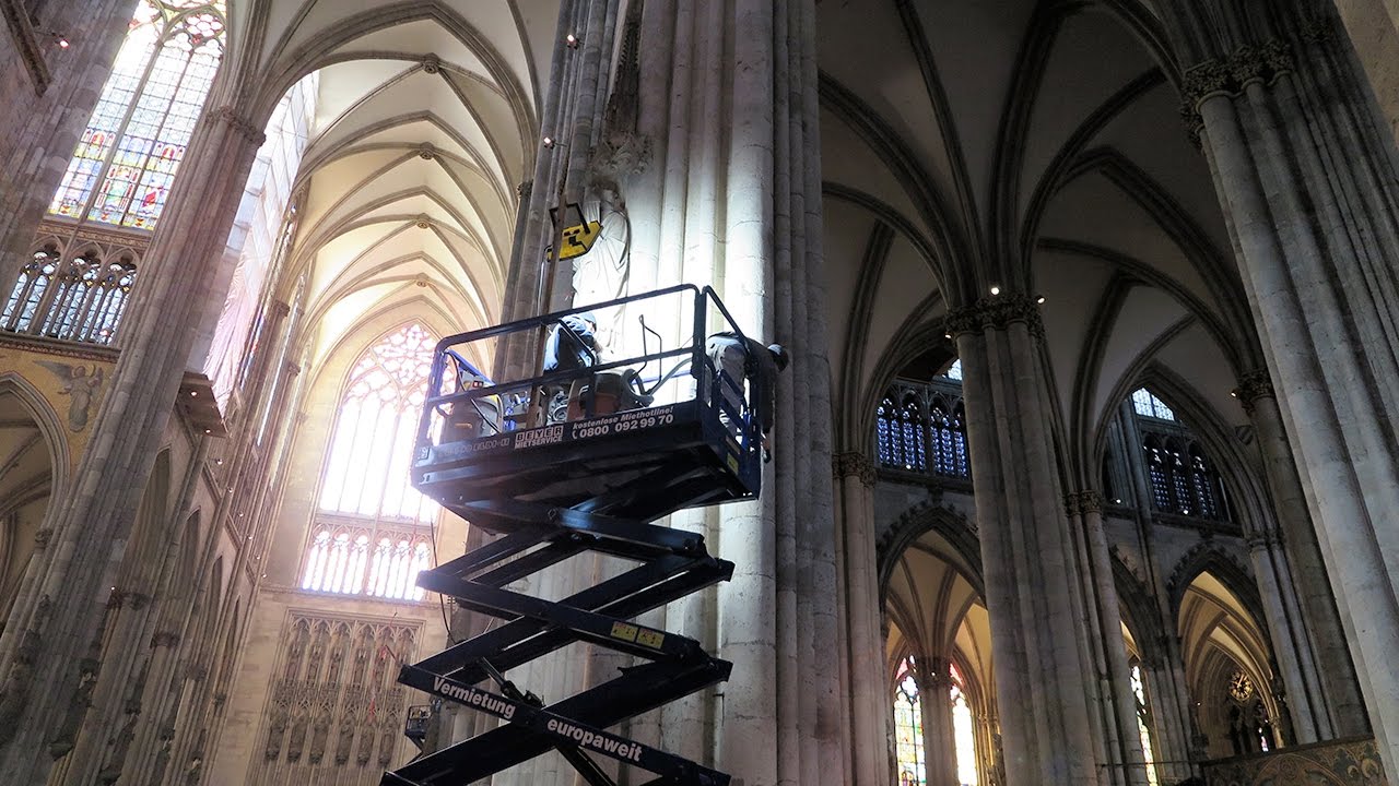 Geräuscharm & wendig – Scherenarbeitsbühne im Kölner DomWährend des eingefahrenen und ausgefahrenen Zustands kann die Arbeitsbühne mittels der 90°-Lenkung und der stufenlosen Proportionalsteuerung zügig gelenkt werden. Die zwei integrierten Elektromotoren bieten einen geräuscharmen und emissionslosen Antrieb der beiden Vorderräder und sorgen für eine maximale Geschwindigkeit von 4 km/h im eingefahrenen und einer maximalen Geschwindigkeit von 0,8 km/h im ausgefahrenen Zustand. Betrieben werden die Elektromotoren über Batterien mit 24 V Spannung und einer Kapazität von 210 Ah.