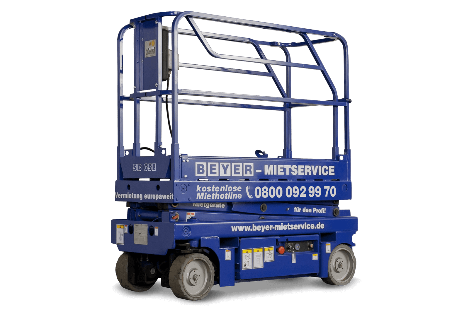 Elektro Scherenbühne mieten | BEYER-Mietservice KGMit ihrer Arbeitshöhe von 6,45 m eignet sich die Hebebühne für Einsätze in der Industrie, im Handwerk, Ladenbau oder Eventbereich. Arbeiten z. B. im Bereich Installation, Dekoration, Wartung, Montage, Reinigung oder Reparatur werden mit der SB 65 E sicher durchgeführt. Der kompakte Scherenlift ist ebenfalls für Malerarbeiten und Elektroinstallationsarbeiten das ideale Mietgerät. Die Plattform der Scherenbühne ist für mehr Bewegungsfreiheit verlängerbar: Der Plattformausschub beträgt 0,92 m.