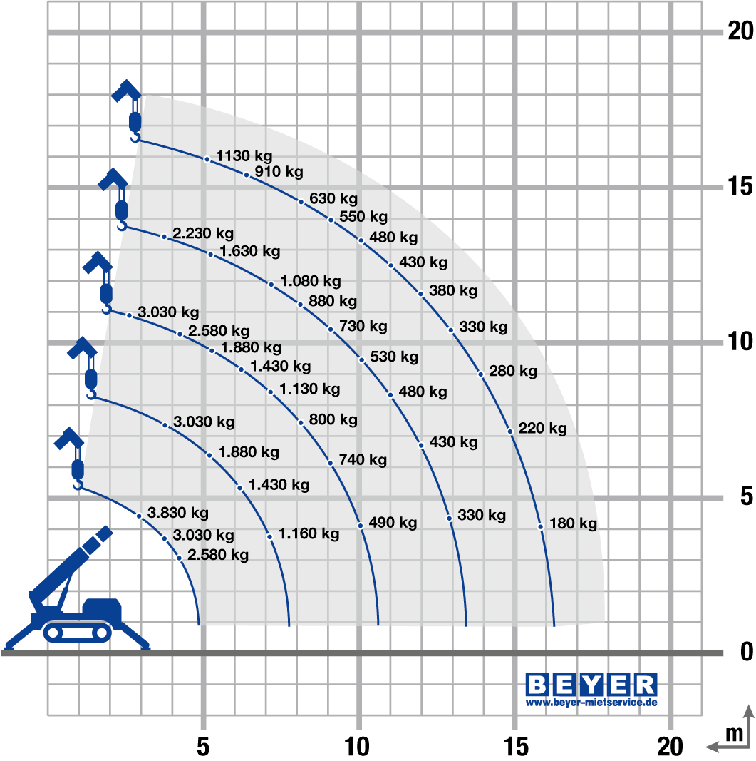 Mini- und Spezialkrane mieten | BEYER-MietserviceWenn Sie diese Kran-Modelle mieten, dann verfügen Sie über einen maximalen Arbeitsradius von 12,50 m. Das Eigengewicht des MC 168.4 K beträgt 5.750 kg. Die Kranspitze hat ein Gewicht von 120 kg. Dieser Minikran-Typ kann im Übrigen auf „normalen“ Kran-Betrieb umgebaut werden, d. h. Sie verfügen über einen vollwertigen MC 168.4.