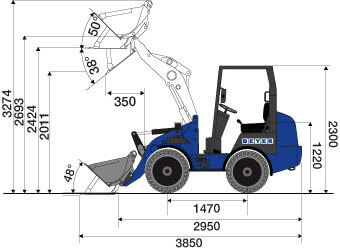 Die kompakten Maße des Radladers mit Erdschaufel (L 3,85 x B 1,20 x H 2,30 m) machen den Radlader mit der Bezeichnung RL 20 zur multifunktionalen Baumaschine mit „Traumfigur“ - auch für effiziente Einsätze in Gebäuden.