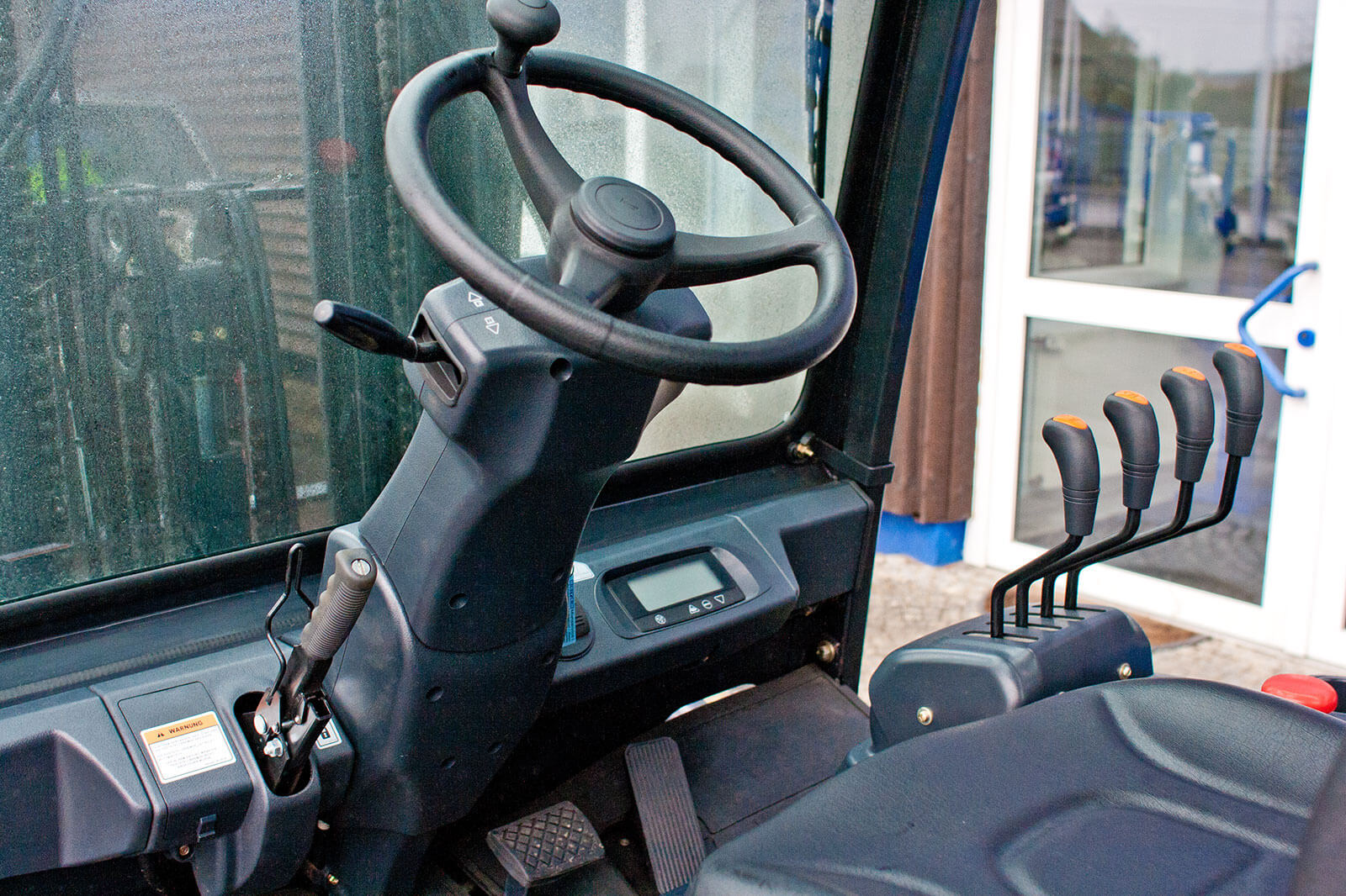Auf dem Instrumentenfeld werden dem Fahrer alle relevanten Informationen, wie zum Beispiel Fahrgeschwindigkeit oder Batterieleistung, angezeigt. Auch Fehlermeldungen werden direkt angezeigt und unterstützen die zeitsparende Fehlerbehebung. Und für eine optimale Arbeitsposition ist die Lenksäule verstellbar. Zwei Arbeitsscheinwerfer vorne sorgen auch bei schlechten Sicht- und Lichtverhältnissen in Hallen und in weiteren Bereichen für optimale Sicht. Die hydrostatische Lenkung, die auch als vollhydraulische Lenkung bezeichnet wird, unterstützt ein ermüdungsfreies Arbeiten. Denn bei der hydrostatischen Lenkung wird die Lenkkraft nicht vom Fahrer, sondern von einer Hydraulikpumpe am Motor des Staplers erzeugt. Der Stapler verfügt über die Active Control Technologie (AC Technik). Der Fahrmotor und der Hydraulikmotor arbeiten bei dieser Technologie ohne Kohlebürsten. Damit verringern sich die Arbeits- und Wartungskosten. Die Aufladung der Hochfrequenzbatterie (80 V/840 Ah) erfolgt über einen 32 A CEE Drehstromstecker.