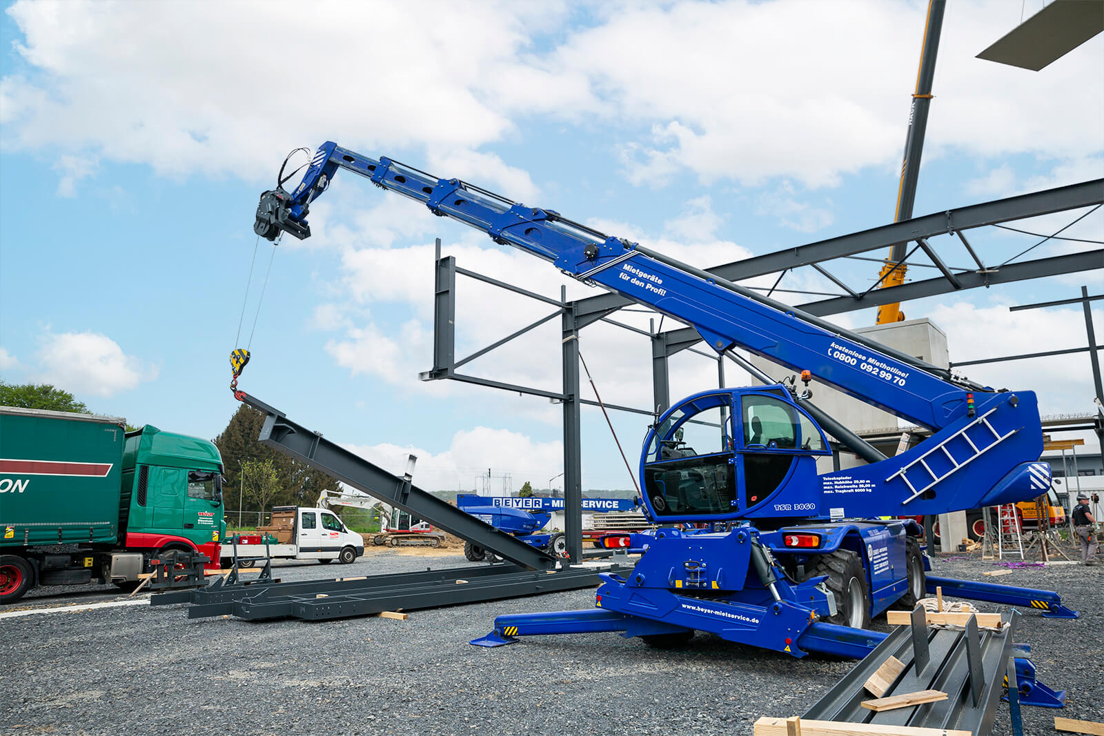 Drehbare Teleskopstapler ermöglichen das Heben und Positionieren von Lasten in verschiedene Richtungen, ohne dass die Maschine versetzt werden muss. Das ist besonders auf engen Baustellen oder bei komplexen Montagearbeiten in Stuttgart ein großer Vorteil.
