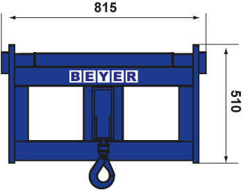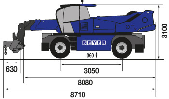 Die Maße des Kranhakens betragen in Länge, Breite und Tiefe 510 mm x 815 mm x 630 mm. Das Eigengewicht des Anbaugeräts liegt bei ca. 120 kg; das Gesamtgewicht des Teleskopstaplers im Einsatz mit Kranhaken beträgt ca. 18.246 kg.