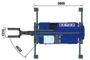 Die Stabilisatoren befinden sich im eingefahrenen Zustand innerhalb der Fahrzeugkontur und die übereinanderliegenden Holme der Stabilisatoren sind am Chassis fixiert. Die Stabilisatoren können mit den Schaltern auf der Schaltkonsole rechts vom Fahrerplatz oder das Multifunktionsdisplay betätigt werden. Mit den zwei Schaltern auf der Schaltkonsole erfolgt die gleichzeitige Steuerung zum Aus- und Einfahren und zum Heben und Senken der vier Stabilisatoren. Um jeden Stabilisator separat zu bewegen, wird das Multifunktionsdisplay verwendet. Sobald die Seite ausgewählt ist, sind die beiden Schalter auf dem Schaltpult rechts vom Fahrerplatz blockiert. Auf dem Display werden die Stabilisatoren, die bewegt werden sollen, ausgewählt und dann werden über einen Joystick die Bewegungen ausgeführt. Nach erfolgter Abstützung wird auf dem Display anhand der elektronischen Wasserwaage der Niveau-Ausgleich geprüft. Auf dem Display gibt es eine Funktion, um den Teleskopstapler automatisch auf den Stabilisatoren zu nivellieren. Je nach gewählter Abstützung wird auf dem Display automatisch das bestmögliche Lastdiagramm angezeigt. Das bietet Sicherheit, denn der Bediener sieht immer die aktuell verfügbare Leistungsfähigkeit des Rotors.