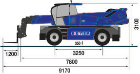 Mit permanentem Allradantrieb, robuster Geländebereifung und einer Bodenfreiheit von 35 cm agiert der Teleskopstapler auf matschigem Baustellenboden ebenso kontrolliert wie bei bis zu 41% Steigung. Drei Lenkarten – Allradlenkung, Vorderradlenkung, Diagonallenkung –, zusammen mit Baumaßen von L 7,80 m x B 2,50 m x H 3,31 m (ohne Gabelträger, mit Rundumleuchte) gewährleisten auch in engen, komplizierten Einsatzsituationen volle Manövrierfähigkeit: Der Wenderadius des Fahrgestells liegt bei 5,14 m. Dank Speedshift-Getriebe für automatisches oder manuelles Schalten während der Fahrt und bis zu 20 km/h Höchstgeschwindigkeit lassen sich Positionswechsel schnell und effizient durchführen.
