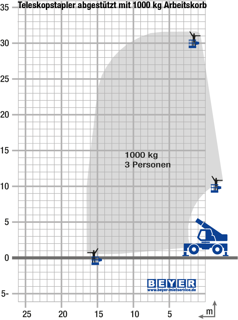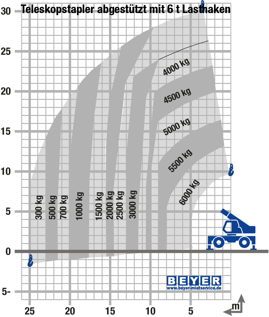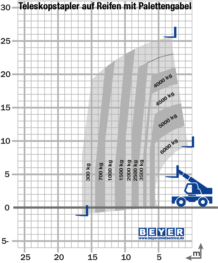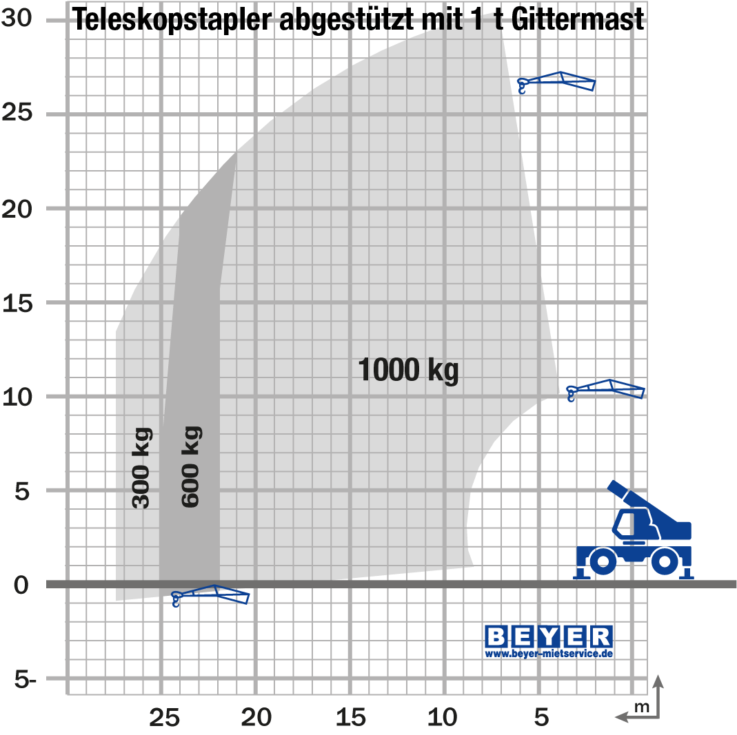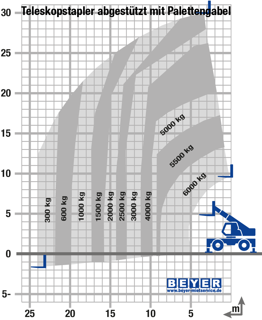 Der TSR 3060 II der BEYER-Vermietung ist mit einer Vielzahl innovativer Assistenzfunktionen ausgestattet. Dynamische Lastdiagramme und das serienmäßige Anbaugeräte-Erkennungssystem E-RECO bedeuten ein Mehr an Effizienz, Übersichtlichkeit und Sicherheit durch automatisches Erfassen kompatibler Anbaugeräte und die Darstellung der entsprechenden Live-Auslegerposition mit Resttragkraft.