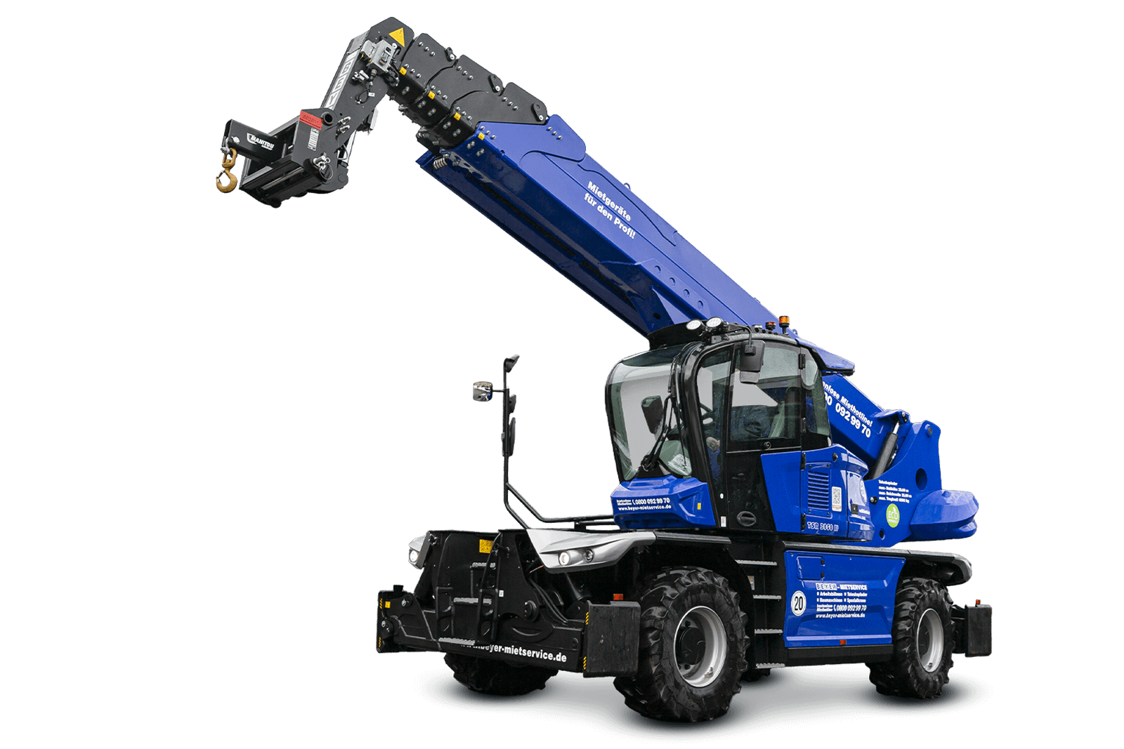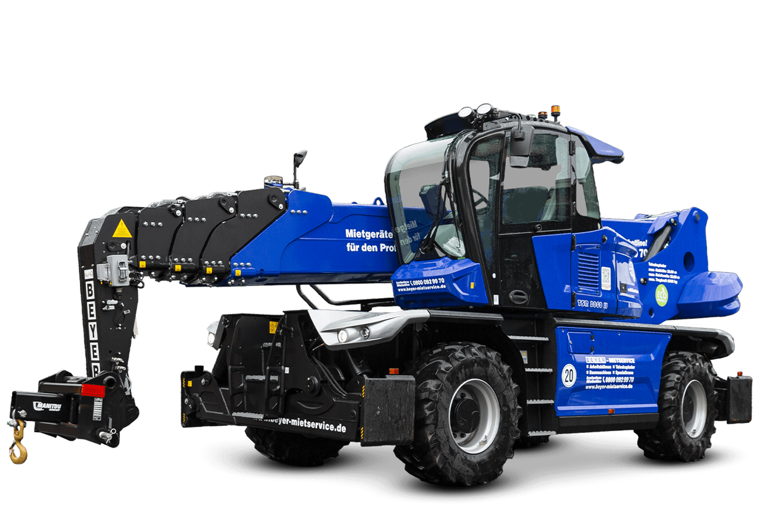 Der TSR 3060 II mit Lasthaken 6 t erreicht abgestützt eine maximale Hebehöhe von 30,20 m sowie eine seitliche Reichweite von bis zu 25,00 m. Bei maximaler horizontaler Ausladung stehen bis zu 300 kg Resttragkraft zur Verfügung, auf voller Hebehöhe bis zu 2.500 kg. Die neuartige, fünfeckige Auslegerkonstruktion des Manitou Rotors sorgt für besonders ruhige und kontrollierte Hubbewegungen und reduziert Schwingungen – ein entscheidender Vorteil bei Arbeiten mit frei hängenden Lasten in großen Höhen und Auslagen.