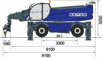 Trotz seiner Maße von L 8,10 m x B 2,60 m x H 3,25 m bleibt der TSR 3580 mobil und wendig. Allradantrieb, Pendelachse und drei Lenkarten ermöglichen Einsätze auf unbefestigtem Untergrund und in Bereichen, die für schwere Autokrane nicht zugänglich sind. Im Datenblatt zum TSR 3580 finden Sie alle relevanten technischen Infos und Lastdiagramme auf einen Blick.