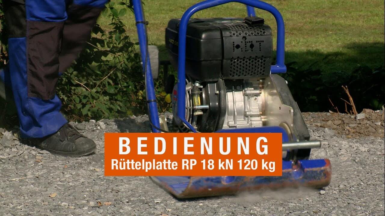 Rüttelplatte RP 18 kN 120 kg mietenDie Rüttelplatte RP 18 kN 120 kg bietet eine Rüttelfrequenz von 85 Hz. Die Rüttelkraft von 1800 daN (Dekanewton) erzeugt eine Zentrifugalkraft von 12 kN (Kilonewton). Die maximale Vortriebsgeschwindigkeit beträgt 20 m / min. Damit lassen sich mittelgroße Areale wie beispielsweise Parkplätze oder Gehwege zügig und mit optimalem Verdichtungsergebnis abrütteln.