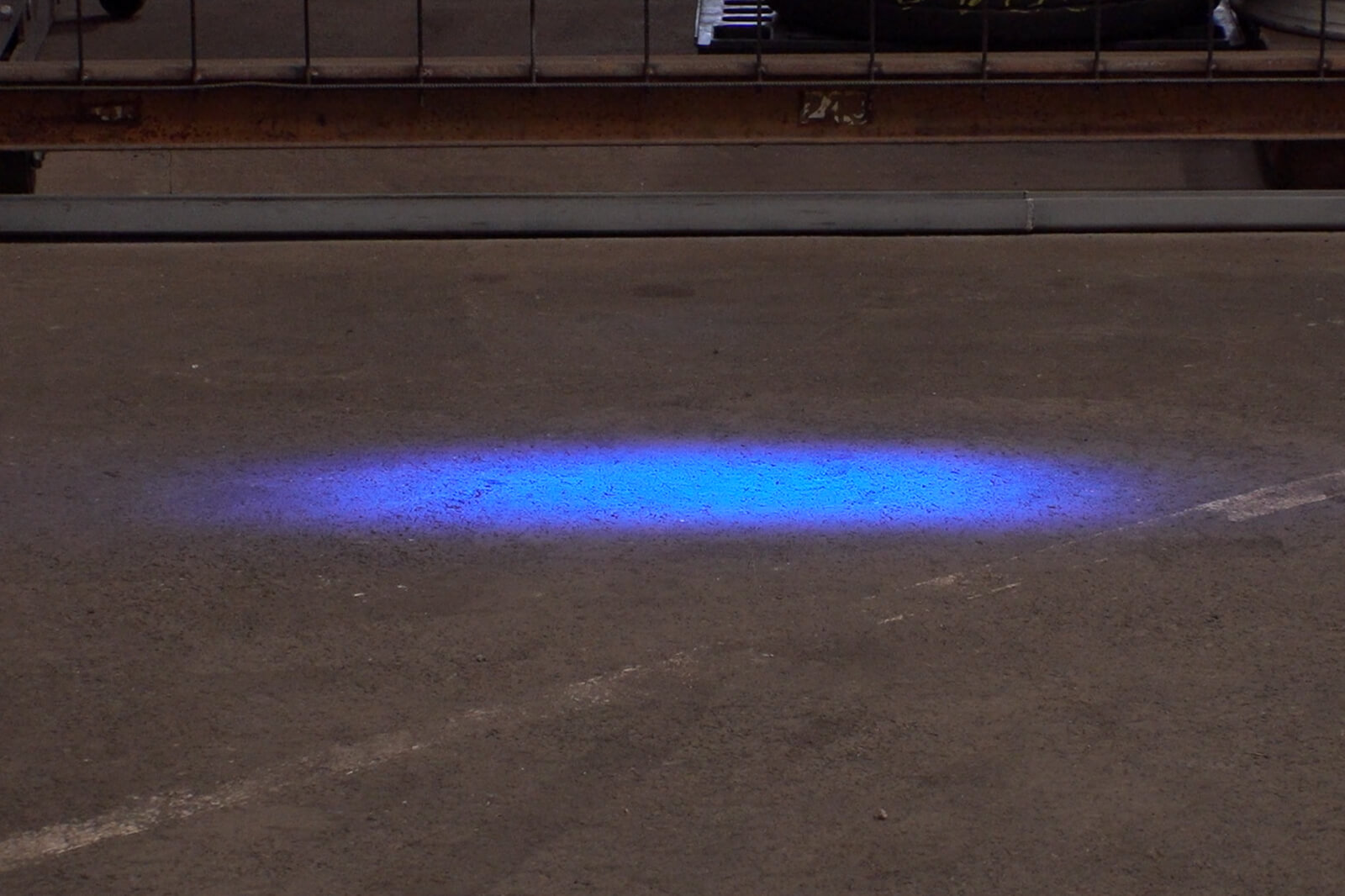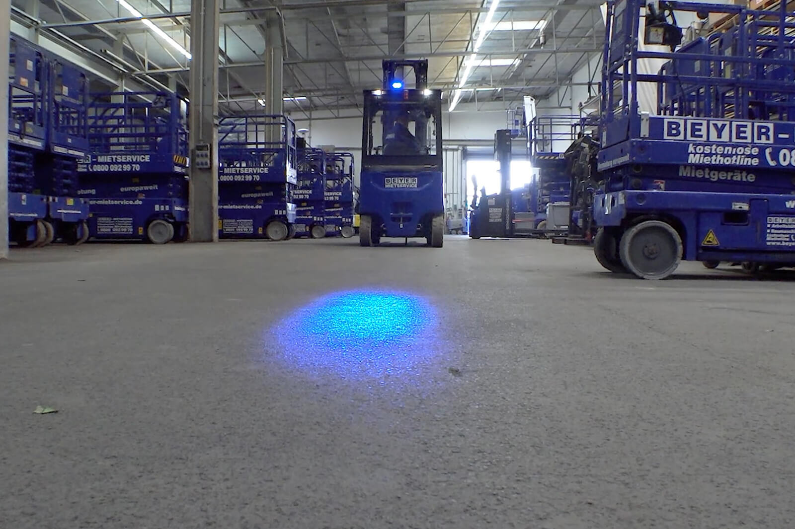 Dieser besondere Arbeitsscheinwerfer gewährt zwar kein Sonder- und Wegerecht, erfüllt jedoch eine ähnliche Signalwirkung. Grund genug, das Sicherheitslicht von Flurförderfahrzeugen genauer zu „beleuchten“. Der Markenname Blue Spot™ ist allgemein gebräuchlich. Offiziell bezeichnet wird das Sondersignal jedoch als Fahrweg-Warneinrichtung, was bereits Rückschlüsse auf die Funktionsweise gibt. Die lichtstarke LED-Leuchte, die am Fahrerschutzdachrahmen montiert wird, projiziert einen blauen Punkt auf den Boden. Dieser Lichtstrahl warnt Fahrzeuge und Fußgänger optisch vor dem sich vor- oder rückwärts nähernden Stapler. Unfällen wird vorgebeugt. So beispielsweise in Schmalganglagern mit sich kreuzenden Gängen, die nicht mit intelligenten Warnsystemen durch Sensoren ausgestattet sind.