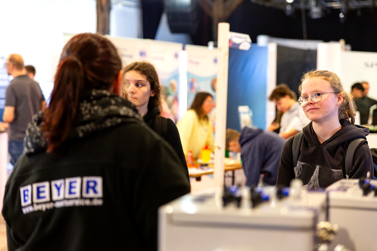 An unserem Infostand standen nicht nur Kolleginnen aus der Personalabteilung, sondern auch Auszubildende aus verschiedenen Bereichen Rede und Antwort. In persönlichen Gesprächen auf Augenhöhe konnten baldige Schulabgänger ihre Fragen loswerden – sei es zu Inhalten der Ausbildung, Aufstiegsmöglichkeiten oder dem Arbeitsalltag an unseren Standorten. Zusätzlich gaben Flyer, Infohefte und praktische Beispiele einen umfassenden Überblick über die vielfältigen Ausbildungs- und Einstiegsmöglichkeiten im Unternehmen.