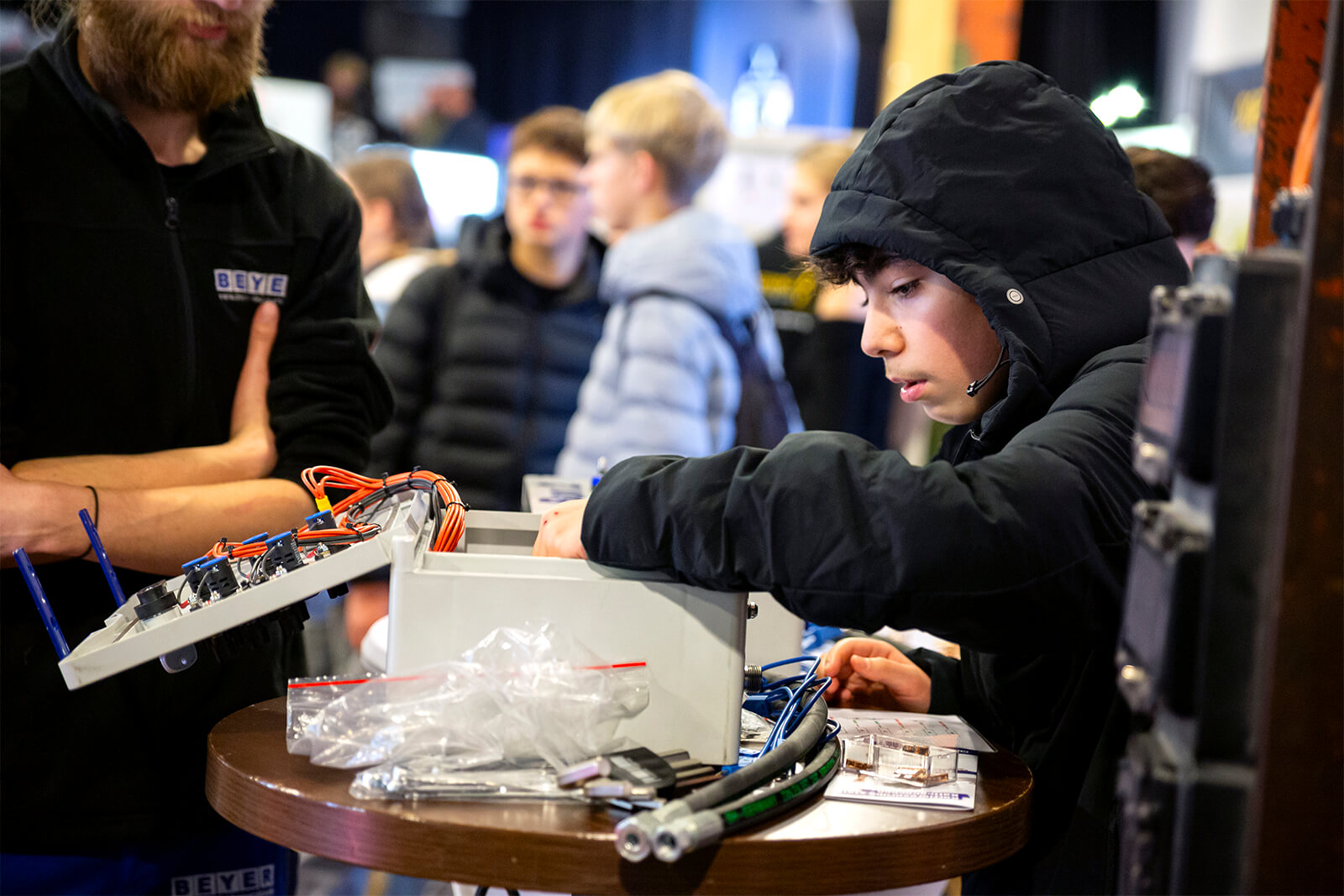 Mit im Messegepäck hatten wir auch wieder unsere interaktive Elektro-Challenge. In der BEYER-Busy-Box galt es, elektrische Verbindungen korrekt herzustellen, Sicherungen zu identifizieren und kleine praktische Aufgaben zu lösen. Viele Besucherinnen und Besucher nutzten die Gelegenheit, auf diese spielerische und lehrreiche Weise Einblicke in technische Ausbildungsberufe bei BEYER-Mietservice zu gewinnen.