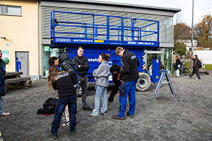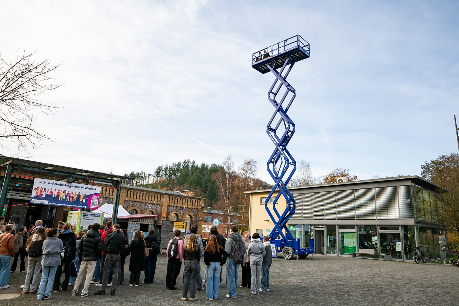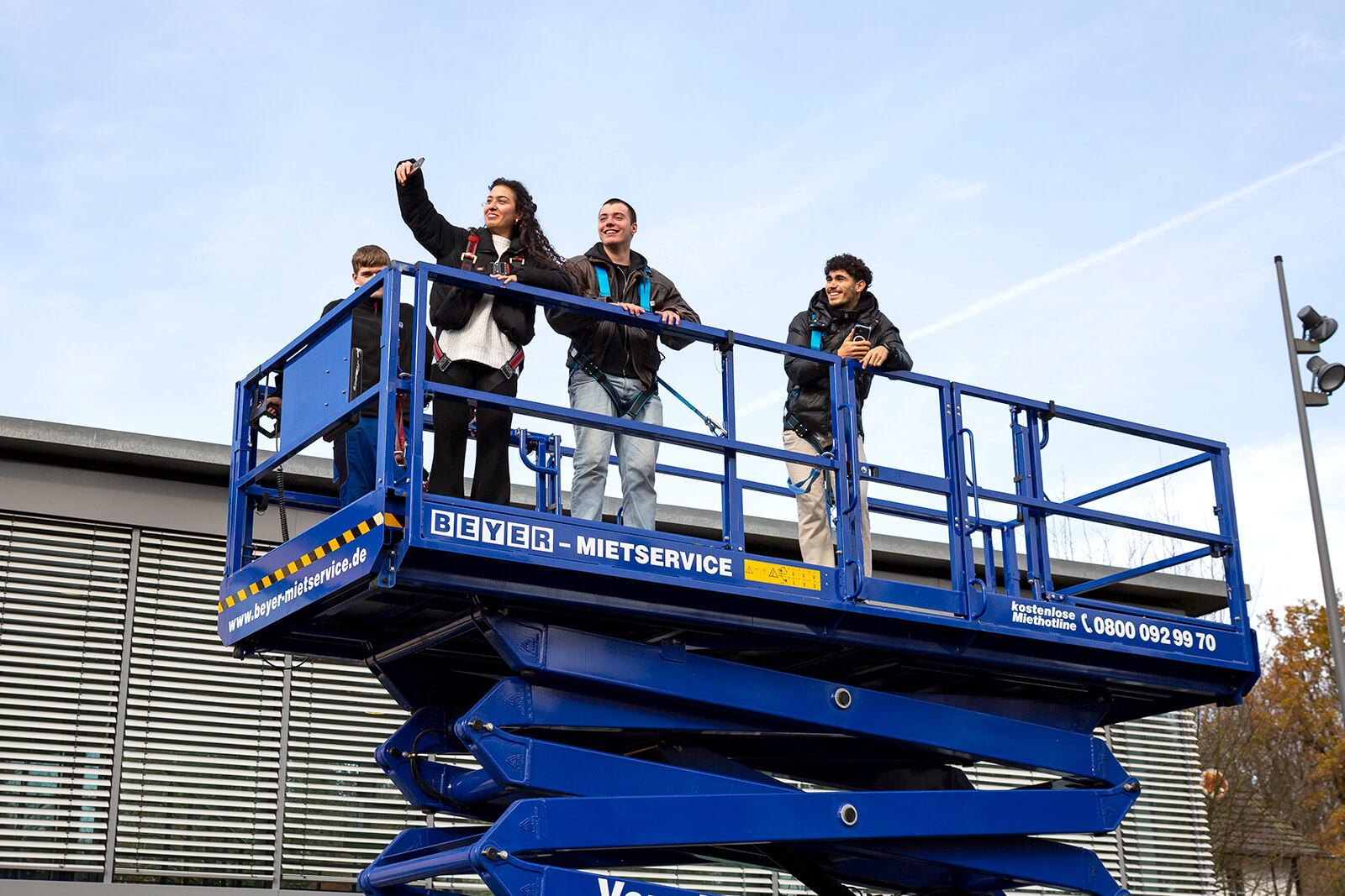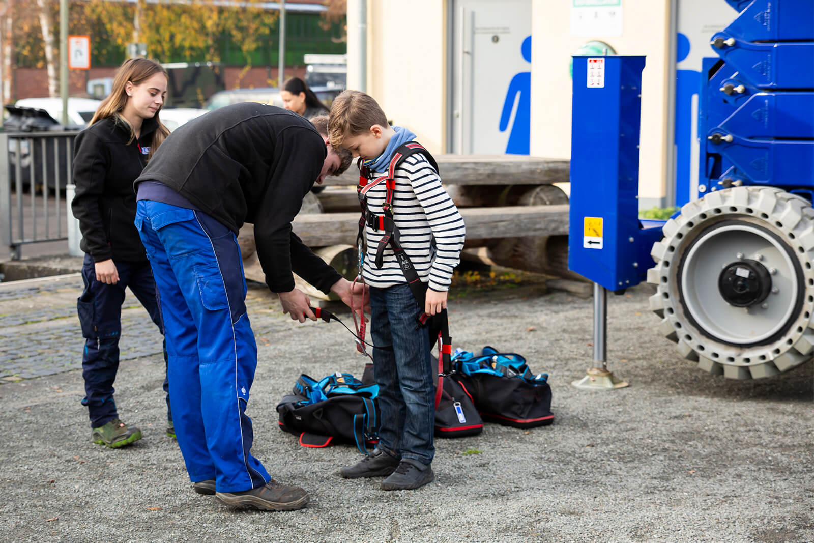 Ein Publikumsmagnet und besonderes Highlight war unsere Scherenarbeitsbühne SB 179 SDL, auf der mutige Besucherinnen und Besucher selbst in luftige Höhen fahren durften. Unter Anleitung unserer Mitarbeitenden und vorschriftsgemäß gesichert konnte jeder, der wollte, live erleben, wie sich das Arbeiten auf einer Personenarbeitsbühne anfühlt und zugleich einen hervorragenden Ausblick über das Windecker Land genießen.