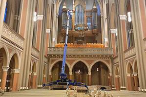 In einem außergewöhnlichen Einsatz war im vergangenen Oktober die Raupenarbeitsbühne RAB 300 T D/E. Um Klang und Optik der imposanten Orgel der Marktkirche Wiesbaden zu erhalten, wurden die Pfeifen und das Gehäuse gereinigt. Mit einer maximalen Arbeitshöhe von 30 m, einer seitlichen Reichweite von 14 m und einer 180°-Korbdrehung ließen sich auch die kleinsten staubigen Ecken auf 20 m Höhe flexibel erreichen.