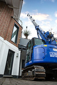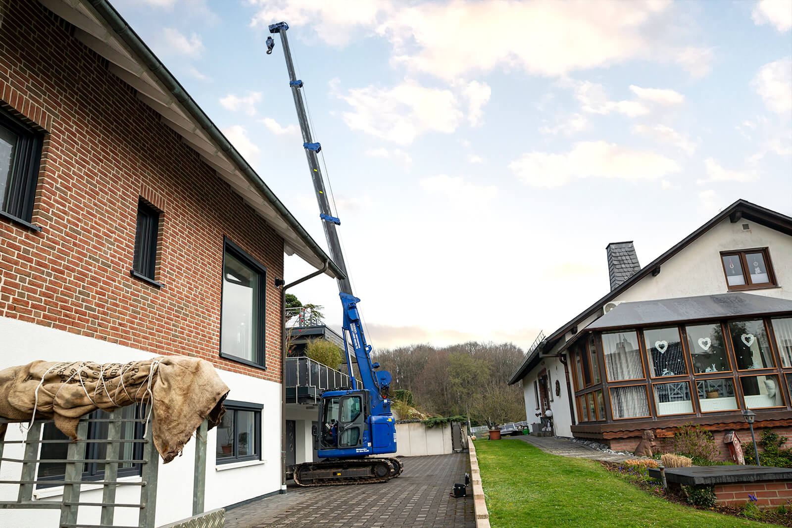 Eine Herausforderung stellte die schmale Zuwegung dar. Der Zugang zur rückseitigen Dachterrasse erfolgte über einen gepflasterten Weg und ließ nur begrenzten Raum für die Positionierung der Hebetechnik. Hier spielte der RC 164.5 D/K II seine Stärken aus: Dank seiner kompakten Bauweise, des Endlosdrehkranzes sowie einem durch das Raupenfahrwerk reduzierten Bodendruck konnte der Kran die Fläche ohne Risiko für die Umgebung bodenschonend befahren.