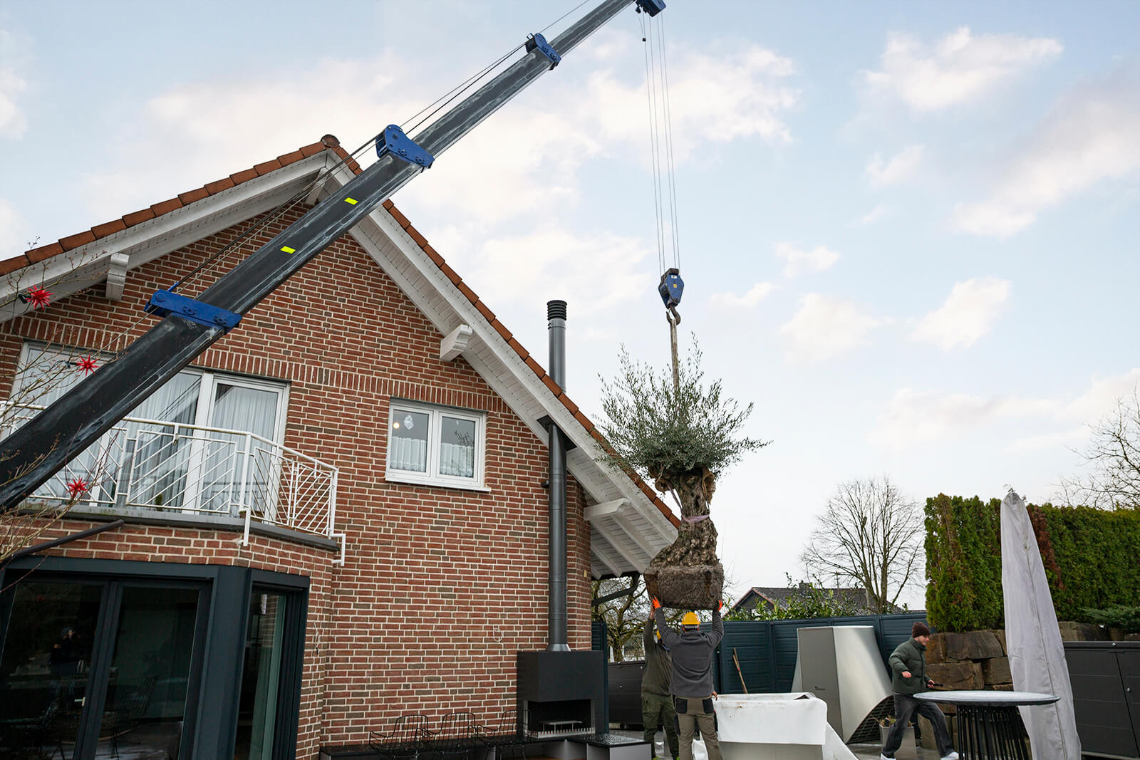 Nicht „Achtung, Baum fällt!“, sondern „Achtung, Baum fliegt!“ hieß es kürzlich mitten in einem Wohngebiet. Ein stämmiger Olivenbaum nahm hier den Luftweg zu seinem neuen Standort auf einer Dachterrasse.