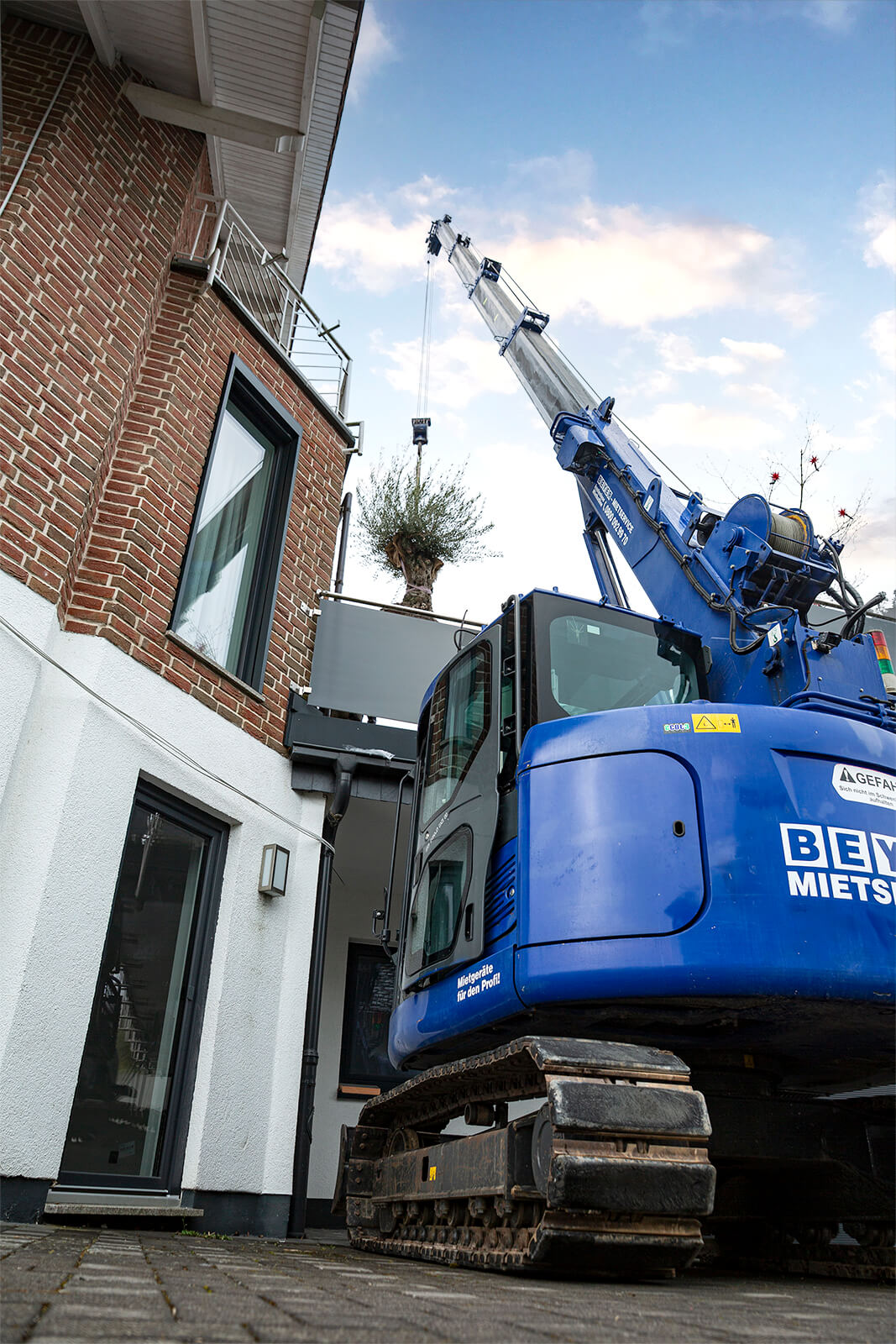 RC 164.5 D K II im Einsatz – Präzision auf engstem Raum | BEYER MietserviceSo sorgt der prächtige Olea europaea ab sofort für mediterranes Flair vor der eigenen Haustür. Sein außergewöhnlicher Weg zum Ziel veranschaulicht zugleich, welche gestalterischen Möglichkeiten sich im modernen Garten- und Landschaftsbau dank spezialisierter Hebetechnik bieten. Auch schwer zugängliche Bereiche wie rückseitige Gärten oder Dachterrassen lassen sich mit passender technischer Unterstützung aus unserem Mietpark sicher und effizient erschließen.
