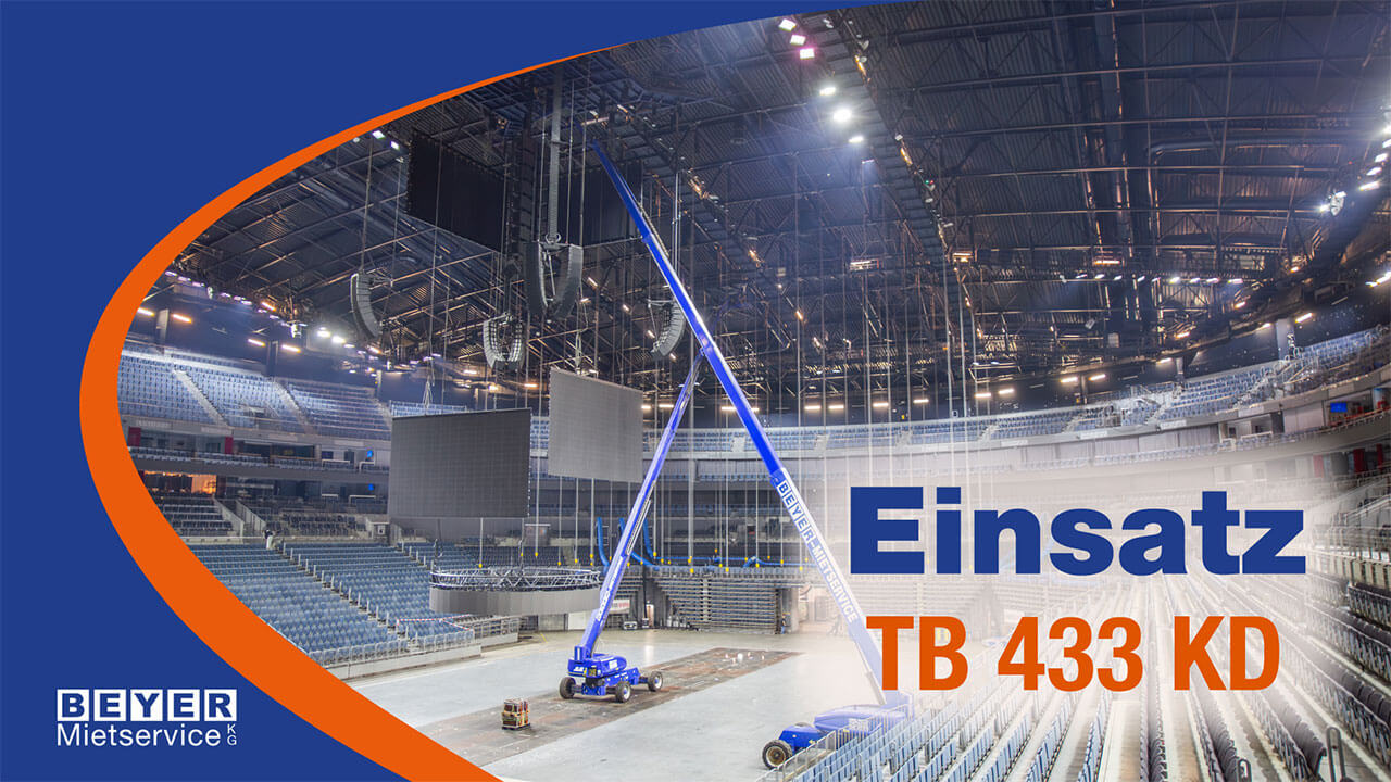 Die imposante Kulisse der LANXESS Arena bot den passenden Rahmen für einen ebenso beeindruckenden Maschineneinsatz. Zwischen Traversen, Lautsprechern, LED-Würfeln und Stahlketten bewegten sich die beiden TB 433 KD mit ihren Körben sicher durch das komplexe Deckengeflecht und ermöglichten exakte Arbeiten in Höhen, die sonst nur über kostspielige Sonderkonstruktionen oder Seilzugangstechniker erreichbar wären.
